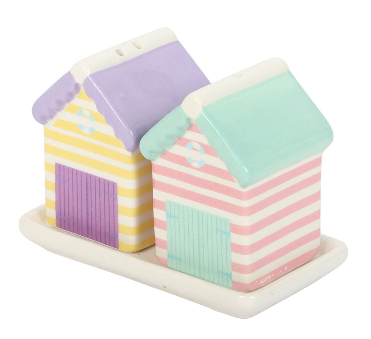 Bring en dose sommeridyll til borddekkingen med disse keramiske salt- og pepperbĂžssene formet som smĂ„ pastellfargede strandhytter â levert pĂ„ et matchende brett med nydelige detaljer. Perfekt gave til deg selv eller en som elsker kyststil og sjarmerende interiĂžr.