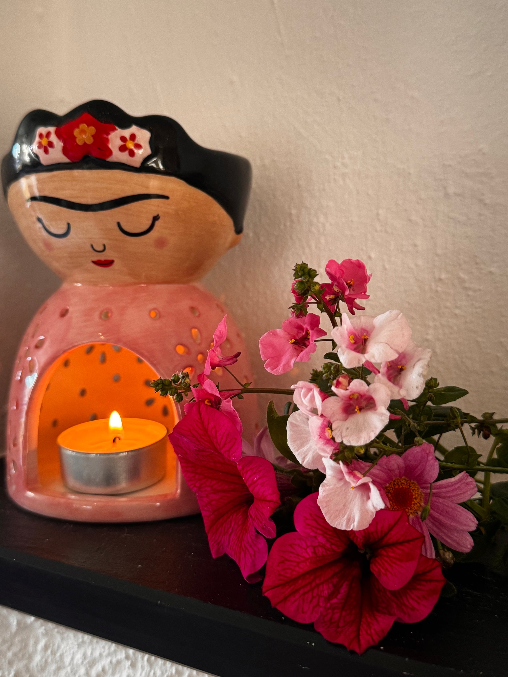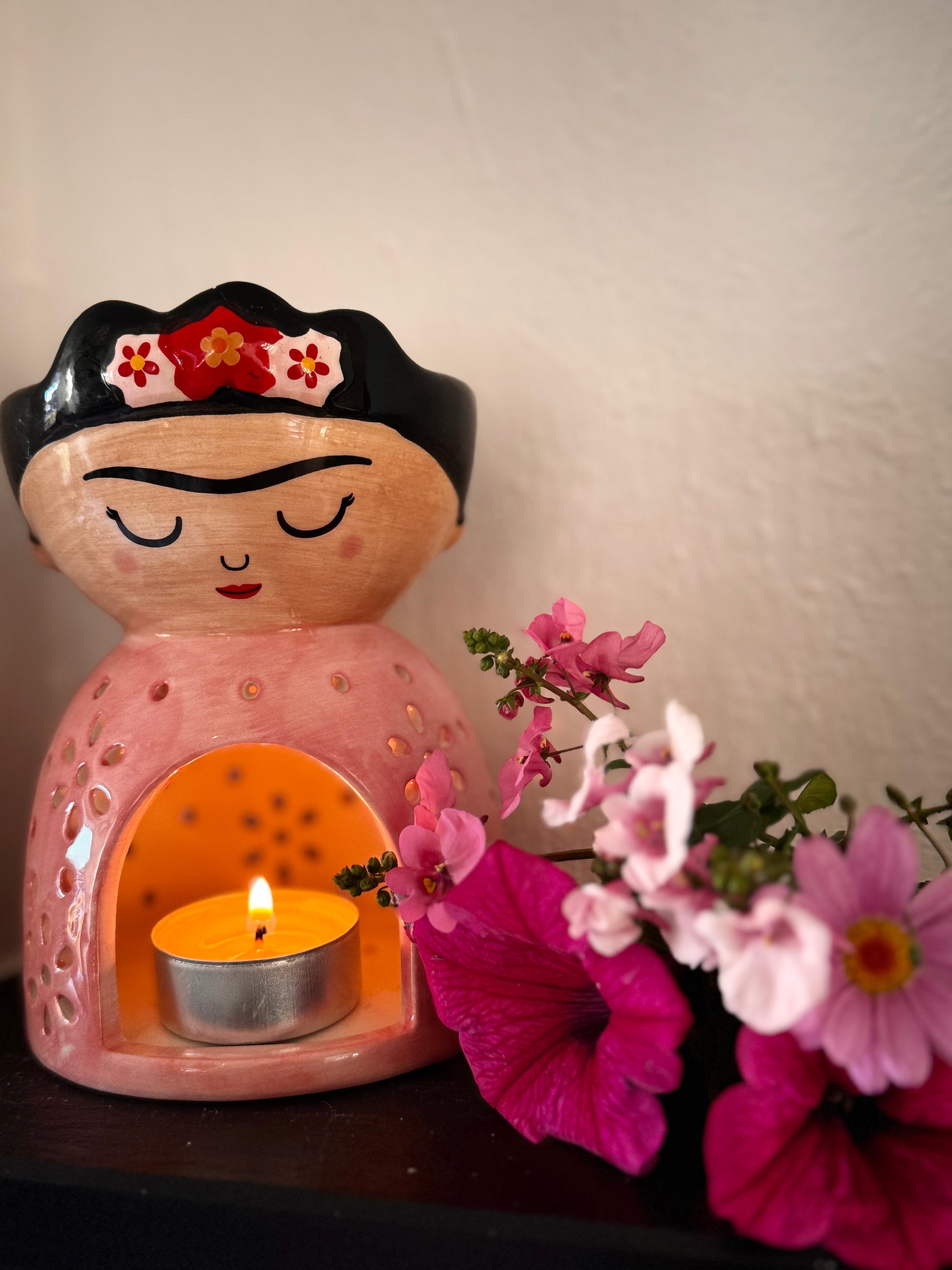 Detaljer: – Materiale: Dolomitt – Farge: Rosa med flerfargede detaljer – Brukes med: Eteriske oljer eller duftvoks – Telys plasseres i kammeret under – Håndmalt – variasjoner i farge og finish kan forekomme – Del av Frida-kolleksjonen