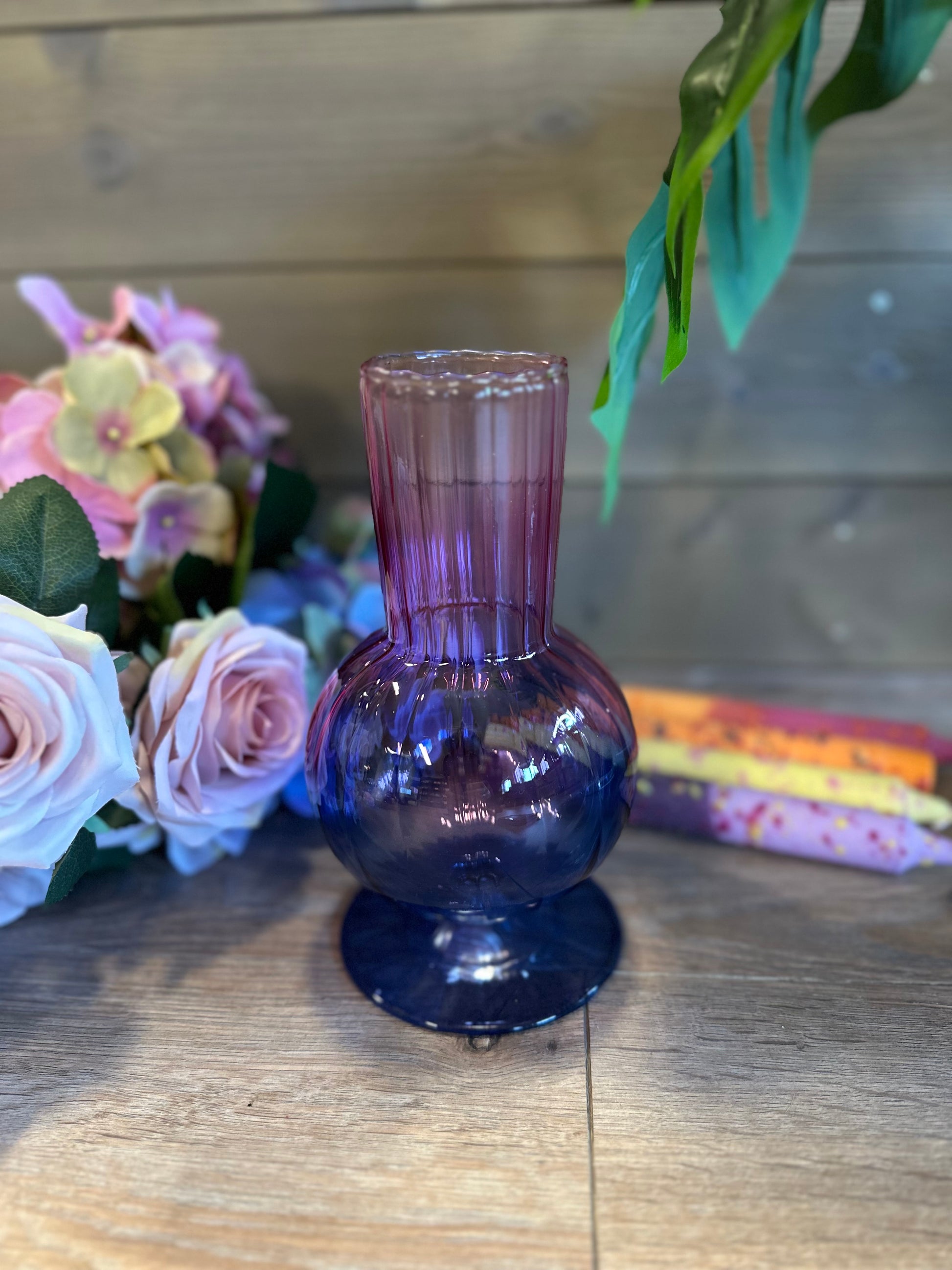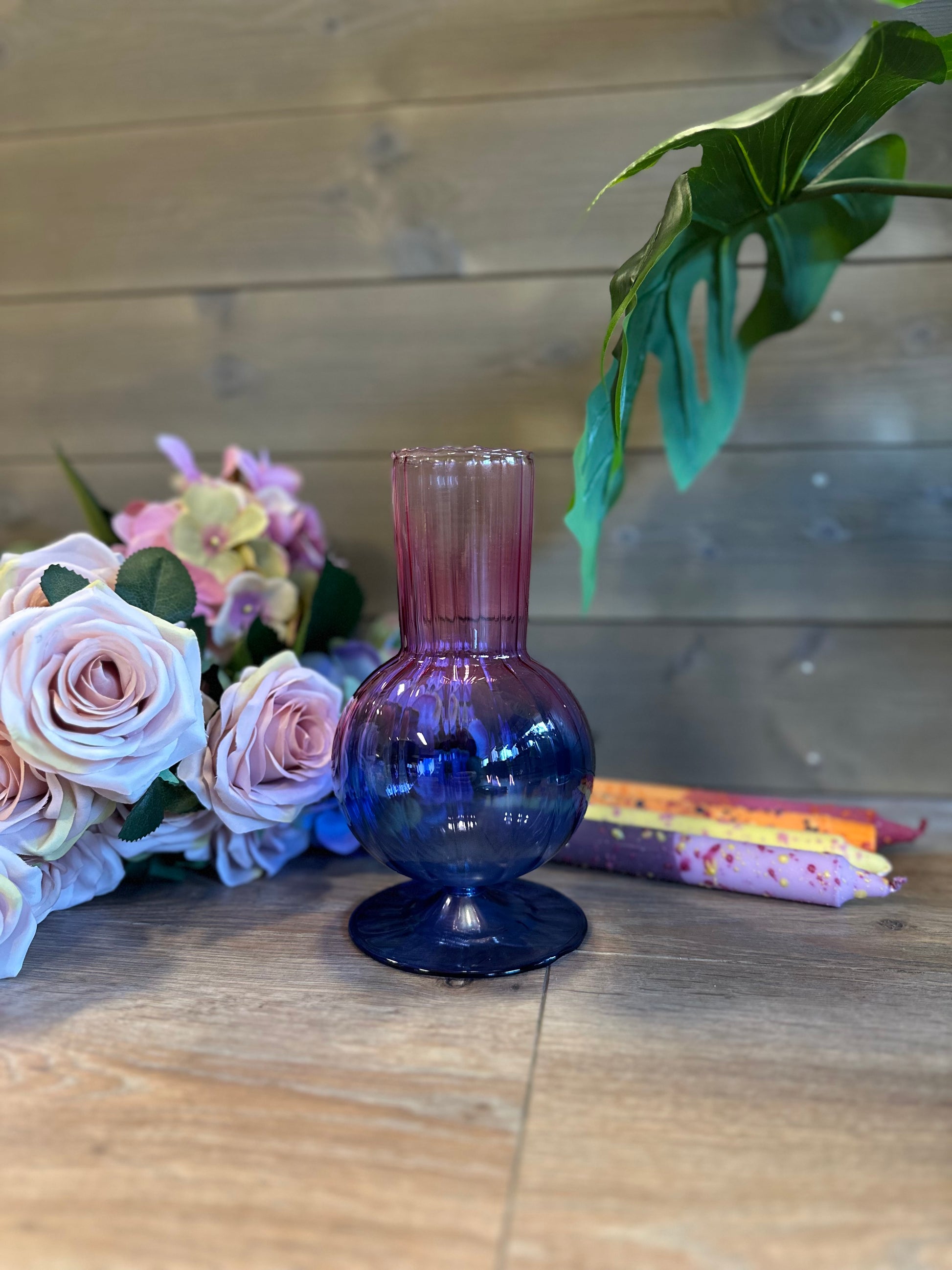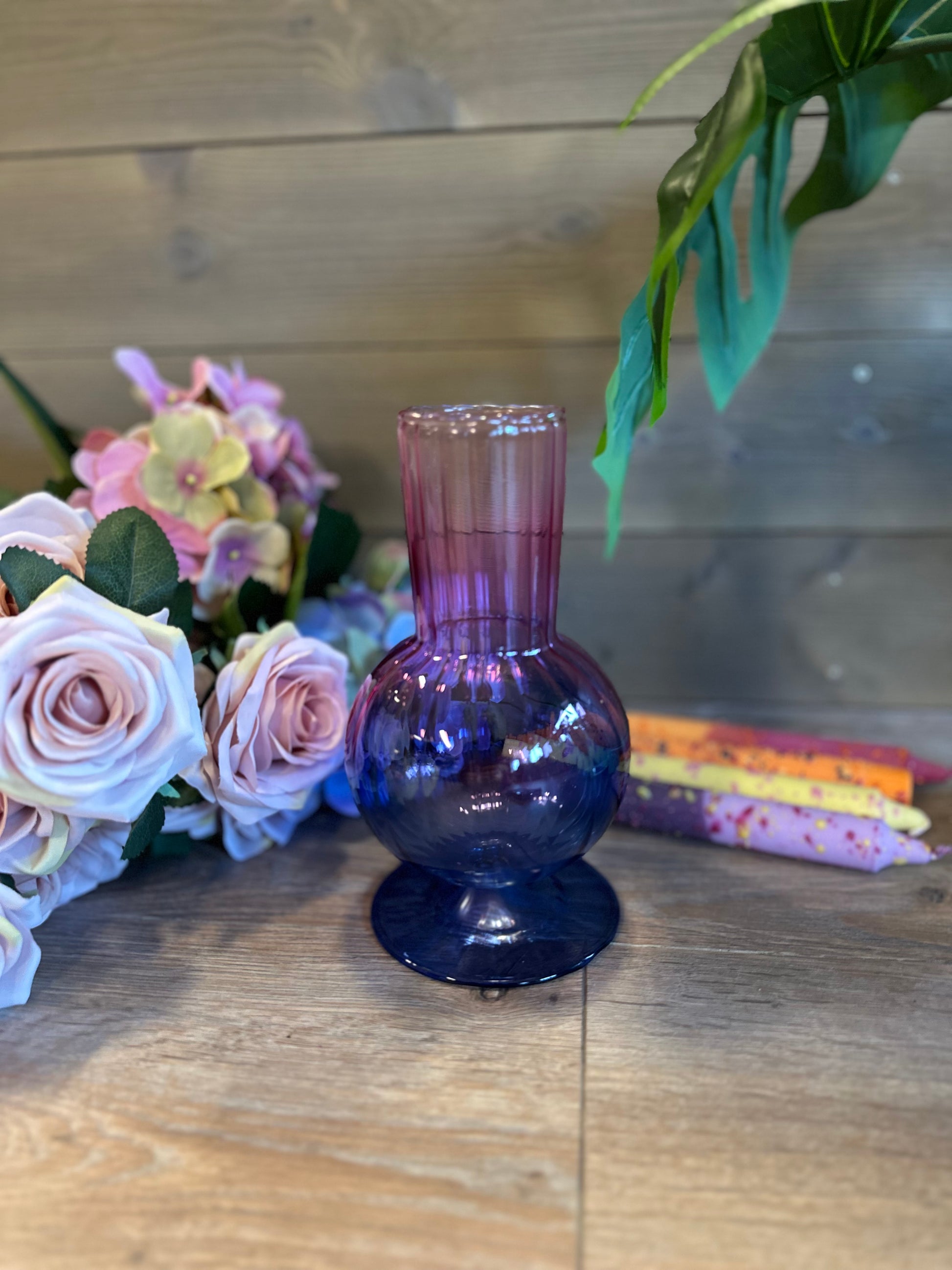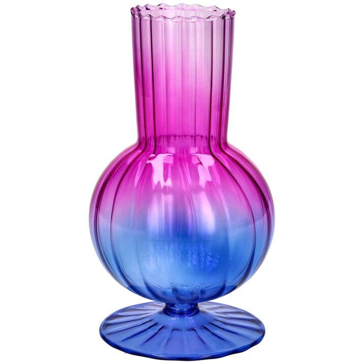 Et ekte blikkfang! Denne lilla glassvasen fra Gift Company har en elegant form med avrundet kropp, bølget topp og stabil fot. Den fargerike overgangen fra dyp rosa til klar blå gir et lekent og moderne uttrykk – perfekt både med og uten blomster.