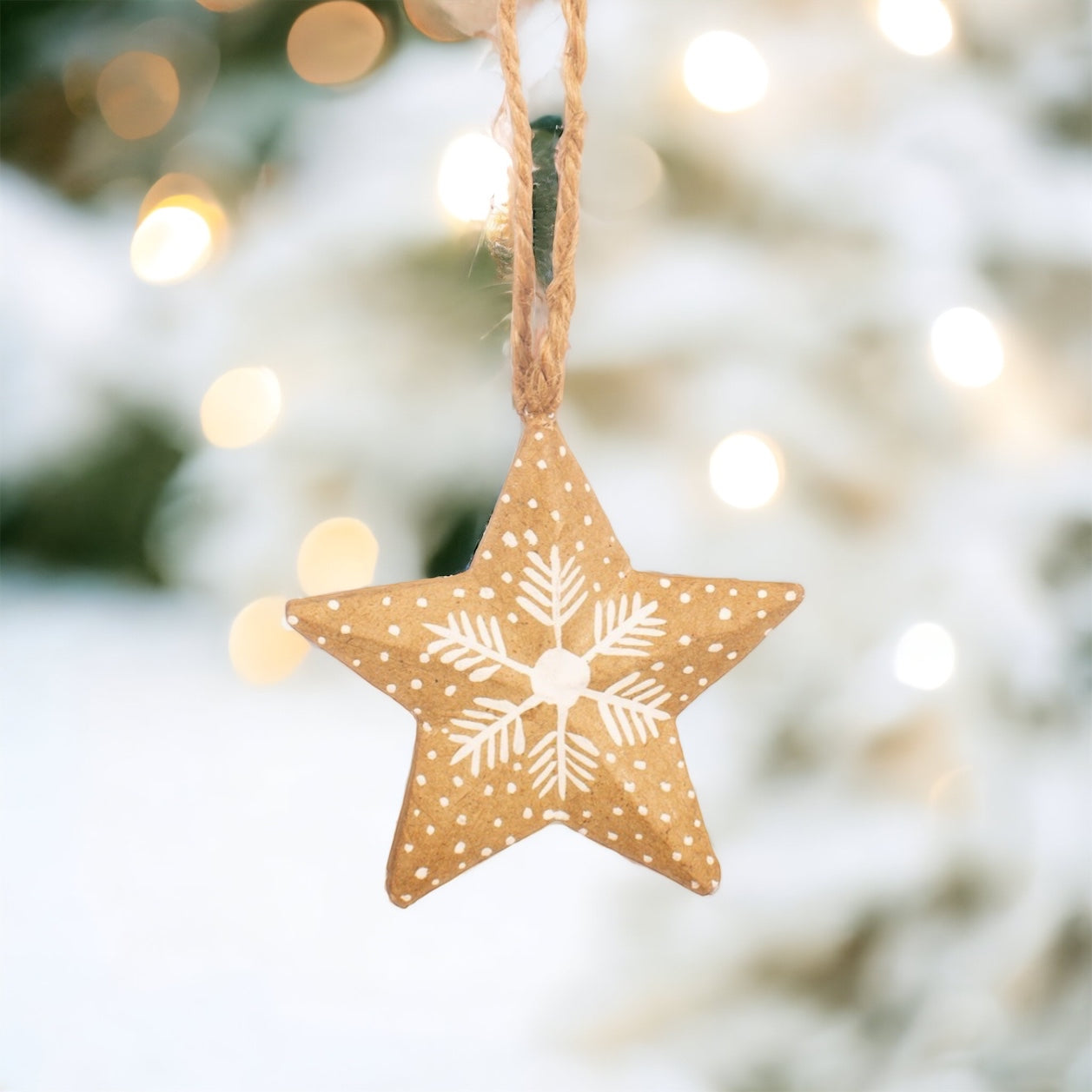 En enkel, men elegant julekule i papirmasje med et stjernemotiv og snøfnugg.