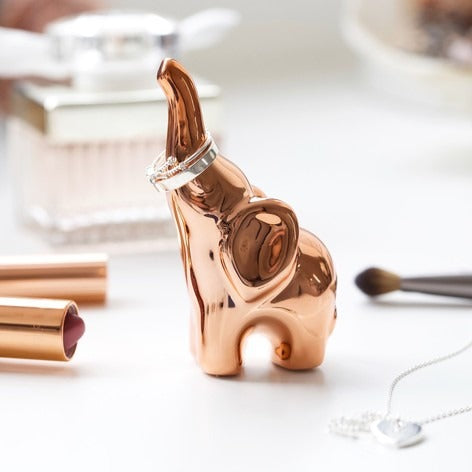 En liten elefantformet ringholder. I polert kobberbelagt keramikk. Fra Lisa Angel Home