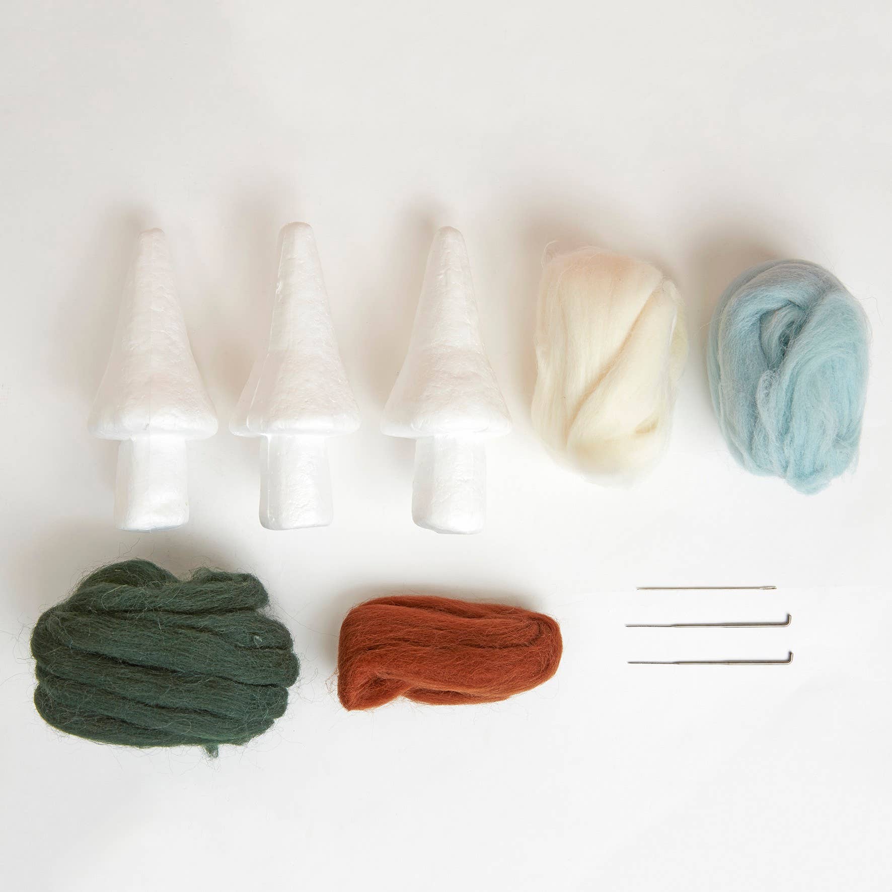Polystyrenformer, ull til nålefilt, filtenål, ferdig utskårne filtbiter, små tilbehør og trinn-for-trinn-instruksjoner.
