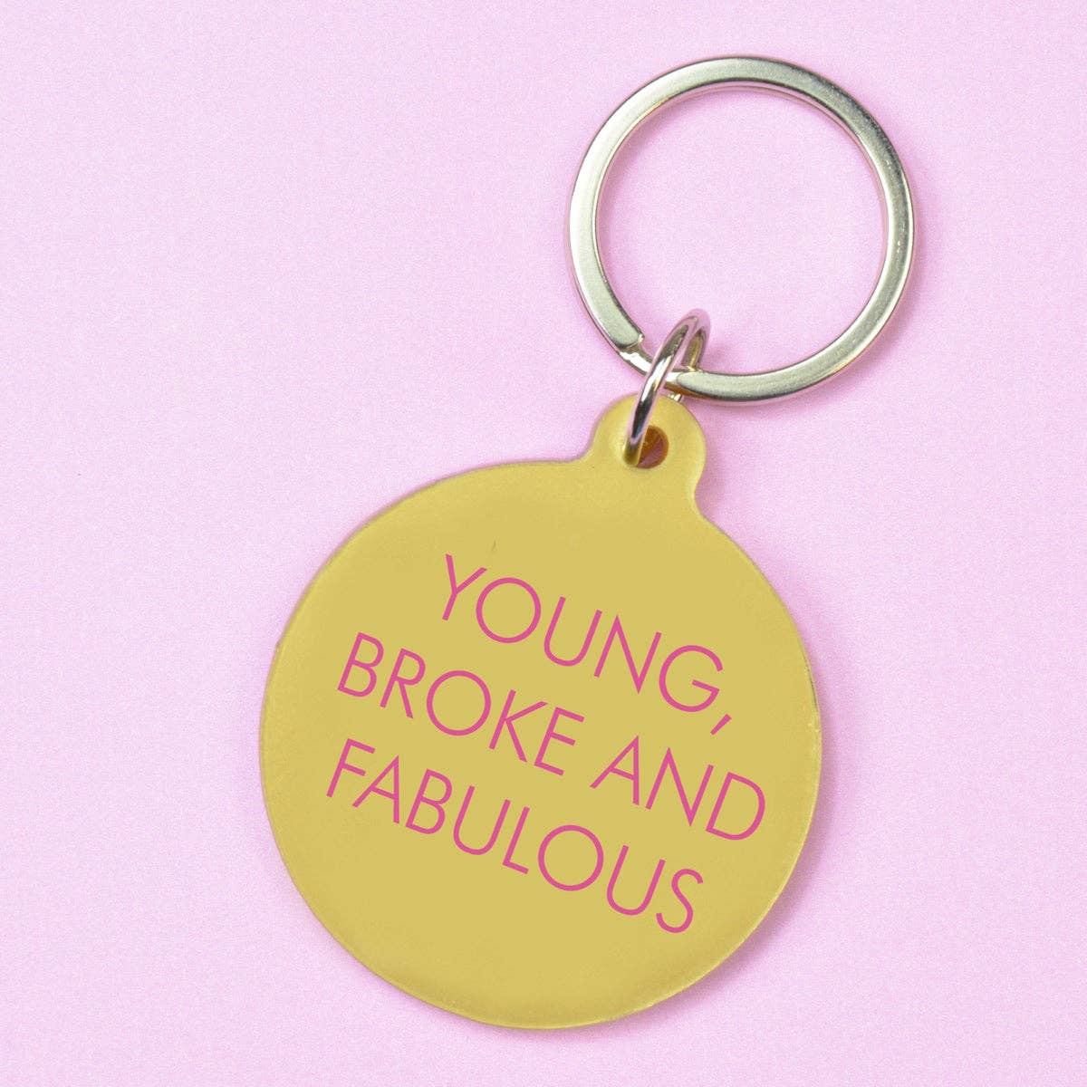 Gi nøklene dine et stilig løft med disse frekke nøkkelringene med slagord! Perfekte som gave – eller til deg selv. “Young, Broke & Fabulous” er inngravert på gullfarget akryl med rosa skrift og en sølvfarget nøkkelring. Leveres med standard baksidekort.
